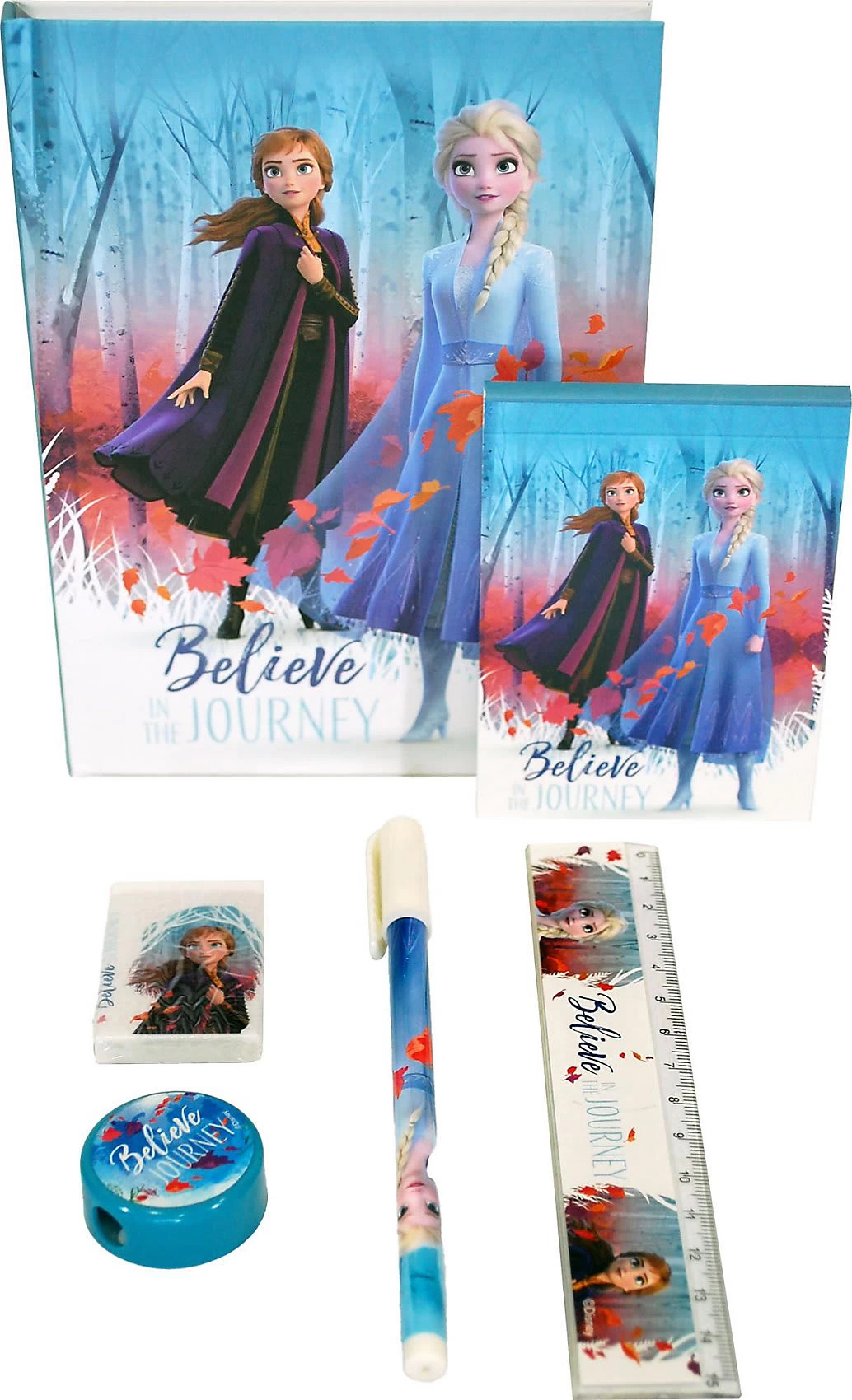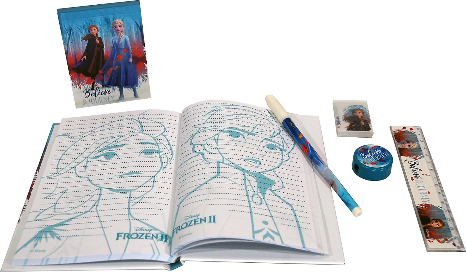Das Schreibset Disney Die Eiskönigin enthält viele praktische Teile mit tollen Anna-und-Elsa-Motiven! Das Set beinhaltet ein liniertes Schreibheft mit Motiven, einen kleinen Block, ein Lineal, ein Radiergummi, einen Anspitzer und einen Stift.