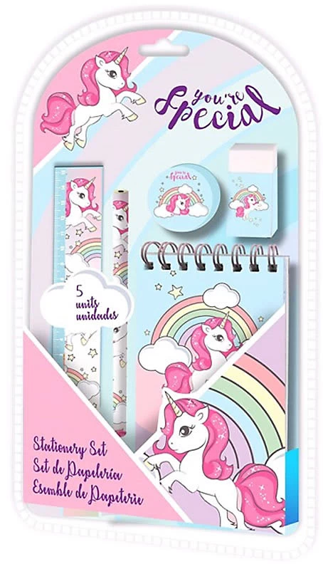 Mit diesem fünfteiligen Schreibset haben Kinder Spaß in der Schule und Zuhause. Im Set enthalten sind ein Bleistift, Lineal, Notizblock, Radiergummi und Anspitzer.